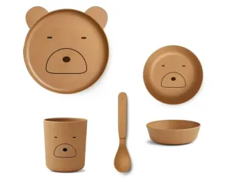 в комплекті входить глибока миска та плочка тарілка, чашка та ложка
