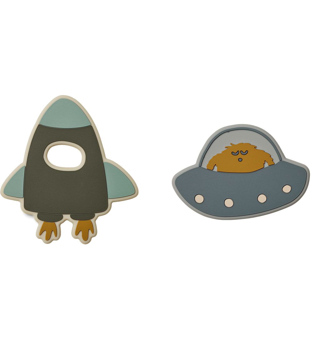 Весела іграшка для прорізування зубів Liewood у наборі з 2 іграшок, включаючи ракетку та НЛО, кольори темно-зеленого, м'ятно-зеленого, пильно-блакитного, бежевого та золотисто-коричневого.