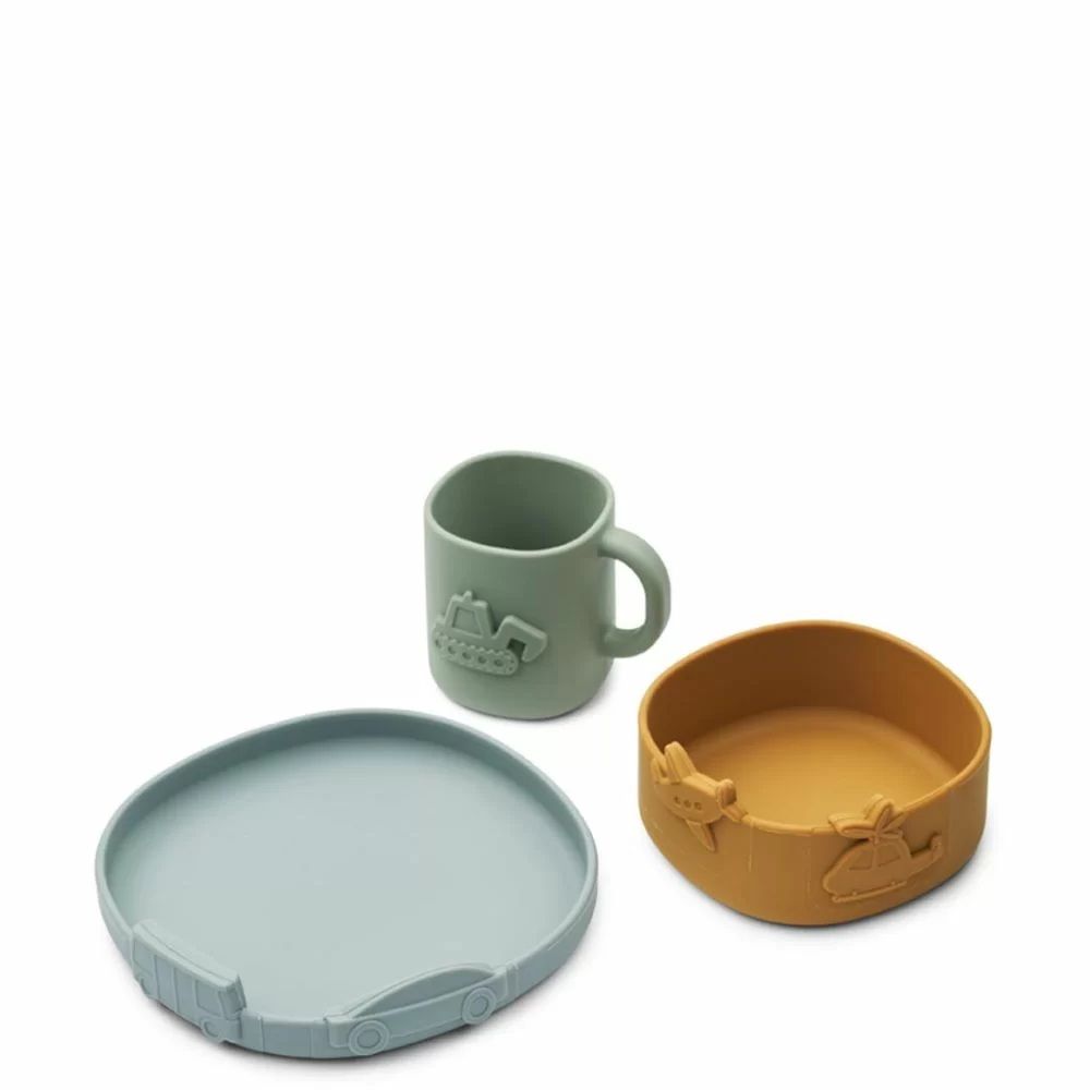 - він складається з миски, тарілки та чашки з грайливими мотивами транспортних засобів
