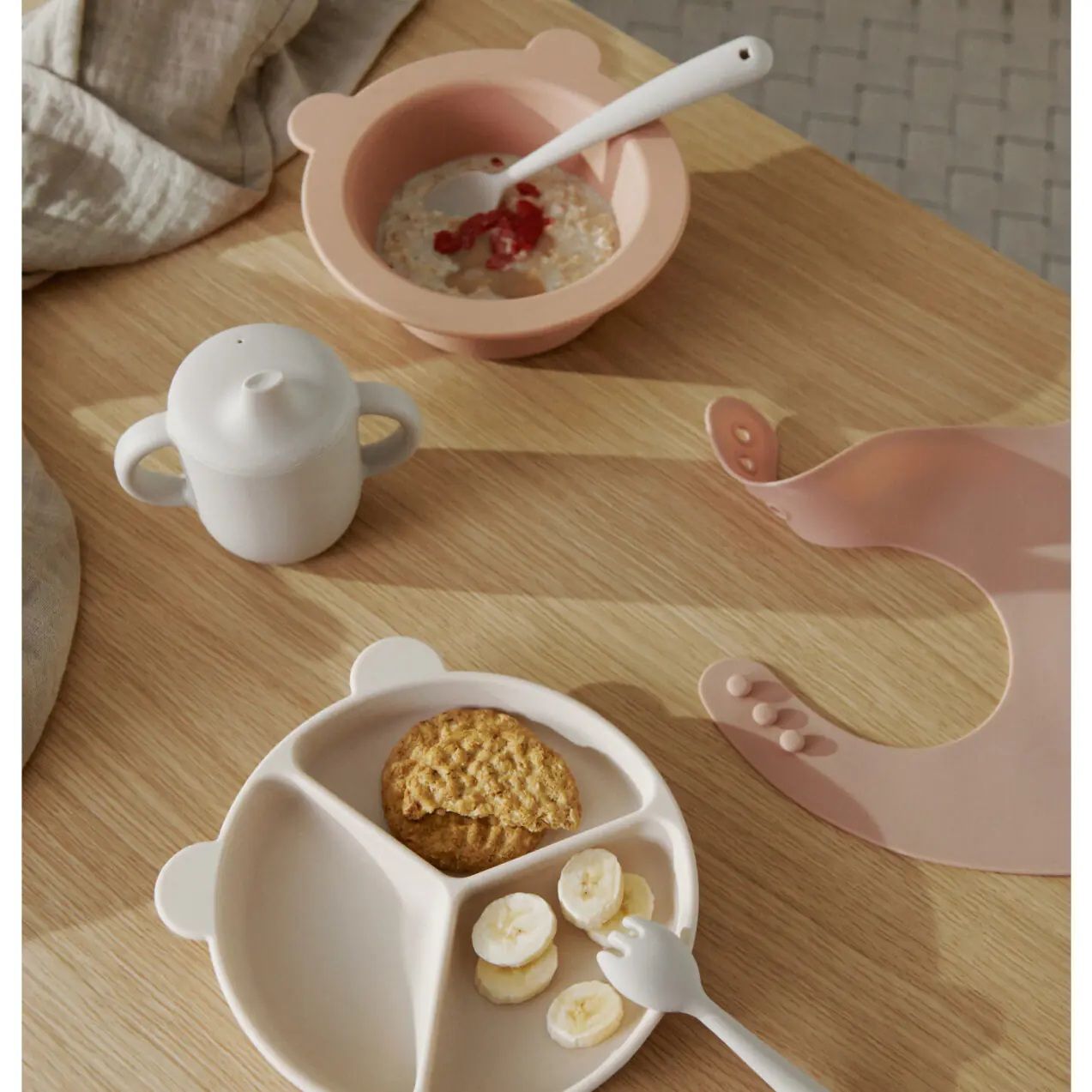 У наборі: чашка для пиття NEIL з ручками, миска PEONY з присоскою, тарілка STACY з секціями на присосках, ложка SIV, виделка SCOTT та фартух EMBER.